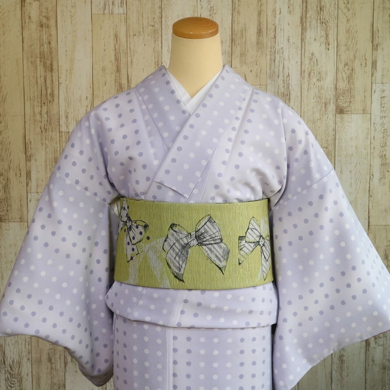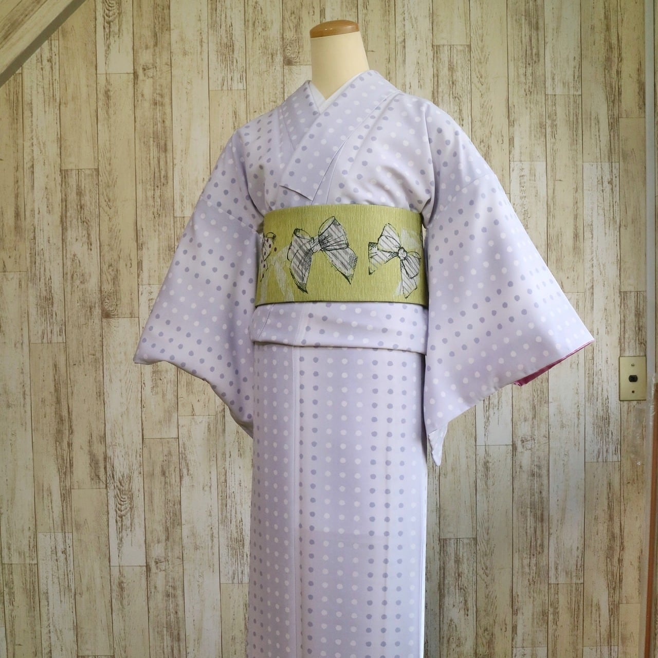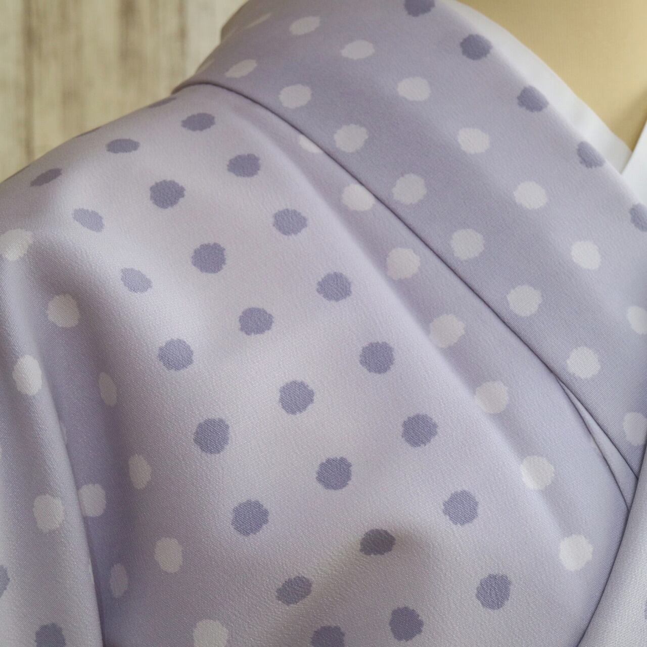 縦にならんだ ドット柄とやわらかな藤色は、おとなっぽい可愛らしさがある着物です。