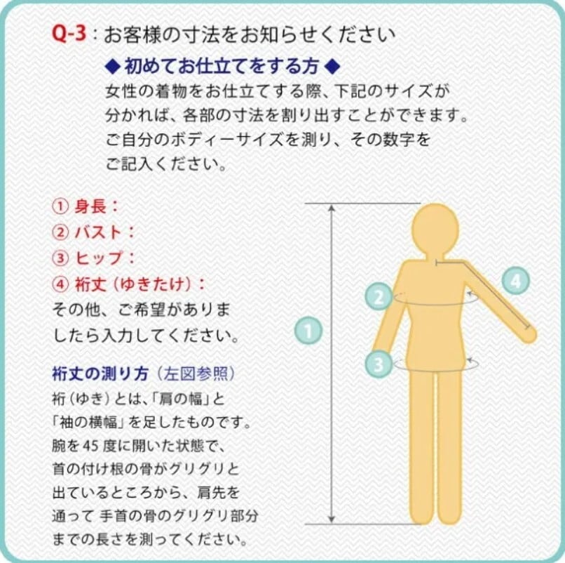 身長・バスト・ヒップ・裄丈の4つです。裄丈の計り方は添付している画像に載せていますので参考にしてください。