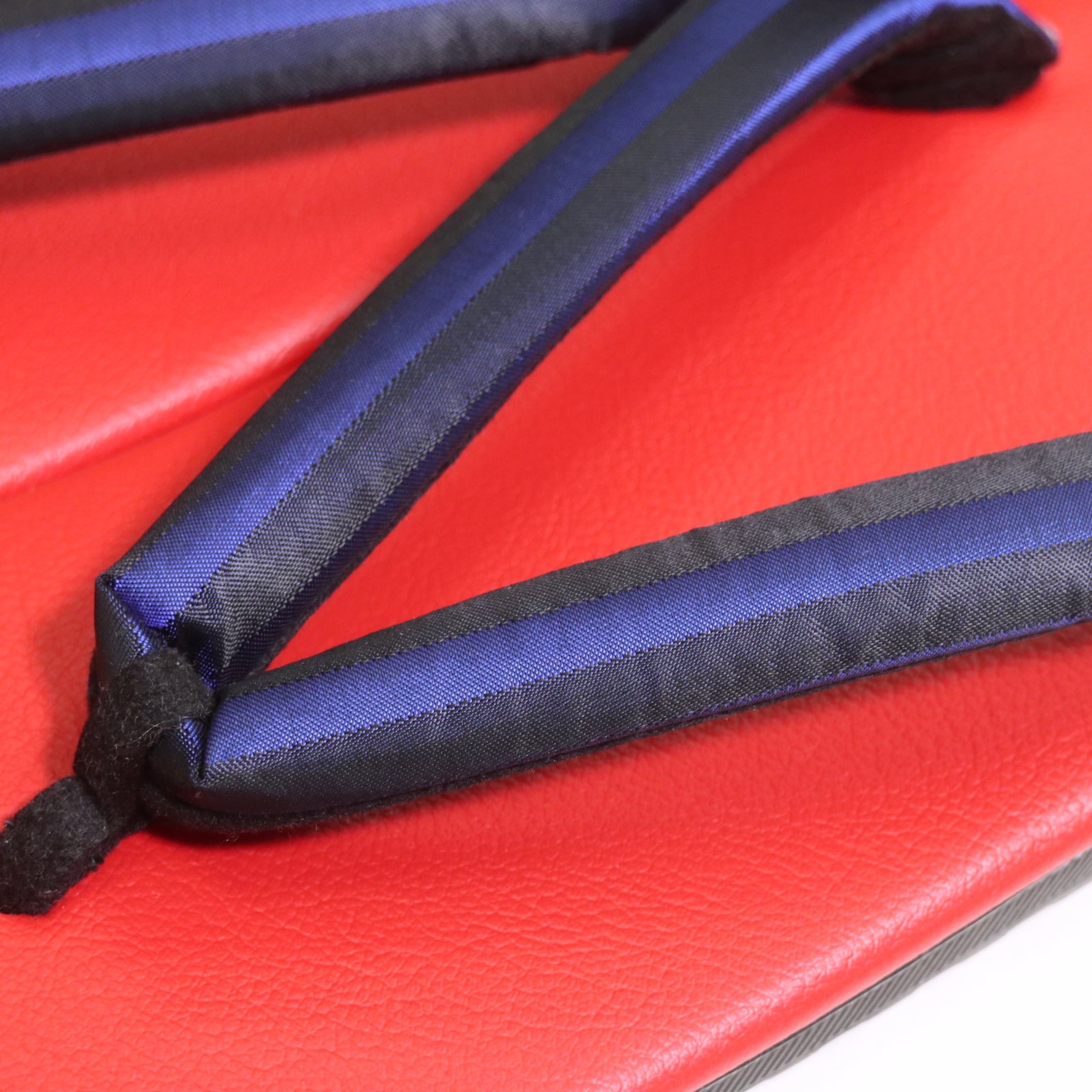 こちらの一足は、台が赤…そして鼻緒がキラリと光るブルーの縞模様です。